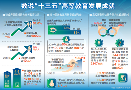 “我国已建成世界规模最大的高等教育体系。”吴岩介绍,“十三五”期间,高等教育毛入学率不断提升,由2015年的40%提高到2019年的51.6%,在学总人数达到4002万。
