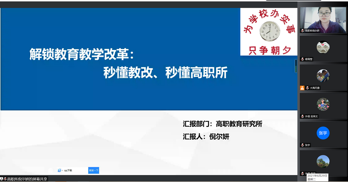 为切实推进教育教学改革工作、全面提升学校整体教学水平,2021年6月29日,受应用外语学院临时行政负责人章国军教授、副院长黄奕云副教授的邀请,高职所倪尔妍老师举行线上分享会,专门就教育教学改革事宜为应用外语学院把脉问诊,为外语教师们申报教育教学类改革项目答疑解惑、传经送宝。