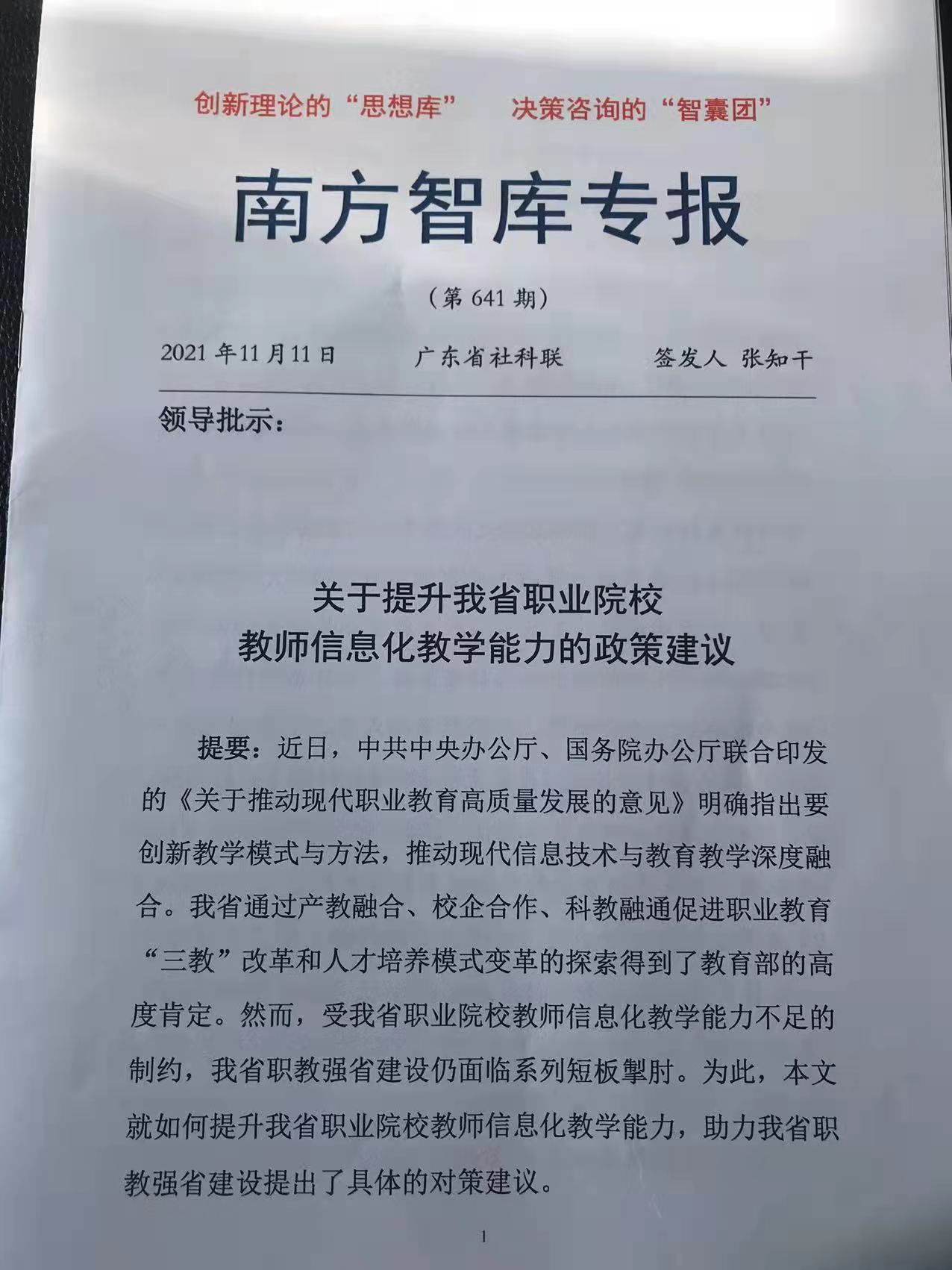 近日,我校职教所报送的《关于提升我省职业院校教师信息化教学能力的政策建议》被广东省社科联《南方智库专报》(第641期)采用上报,呈送省委、省政府、省人大和省政协四套班子领导决策参考。